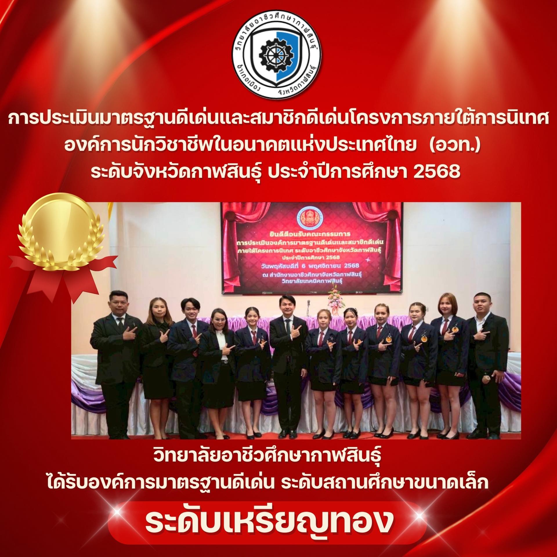 องค์การนักวิชาชีพในอนาคตแห่งประเทศไทย วิทยาลัยอาชีวศึกษากาฬสินธุ์  ได้รับองค์การมาตรฐาน ระดับเหรียญทอง🏅 จากการเข้ารับการประเมินองค์การนักวิชาชีพในอนาคตแห่งประเทศไทย สมาชิกดีเด่นภายใต้โครงการนิเทศ ประจำปีการศึกษา 2568 ระดับจังหวัดกาฬสินธุ์